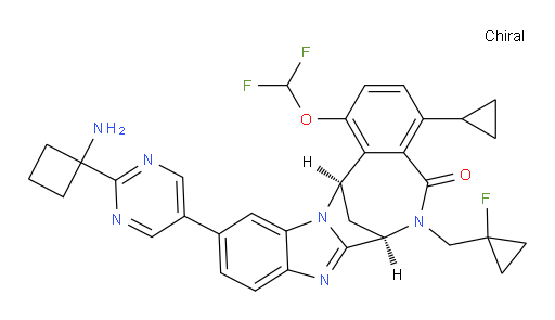 Smiles | O(C1C=CC(C2CC2)=C2C=1[C@@]1([H])C[C@@]([H])(N(C2=O)CC2(CC2)F)C2=NC3C(=CC(C4C=NC(C5(CCC5)N)=NC=4)=CC=3)N12)C(F)F |